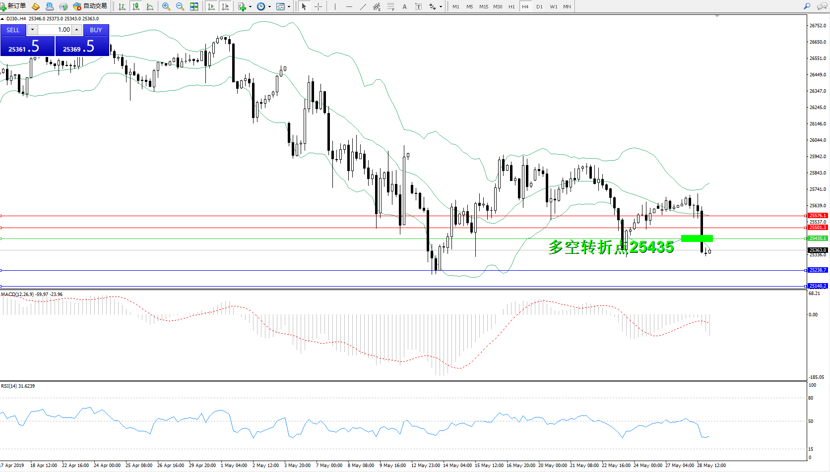 道琼斯指数DJ30—— 4小时K线图显示: