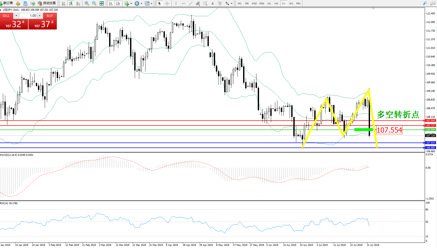 交易策略:107.554下方看跌,目标107.014、106.805