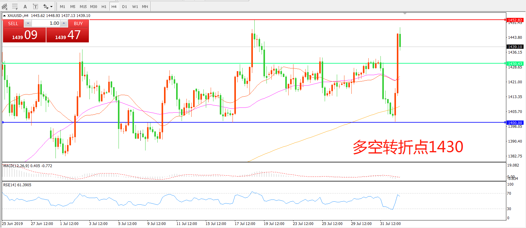 4小时图看,金价长阳连续拉升,整体十分强势,前期跌幅被全部收复,1430阻力被突破,均线系统拐头向上,MACD红柱缩短,RSI指标向上,中期走势仍然偏多。