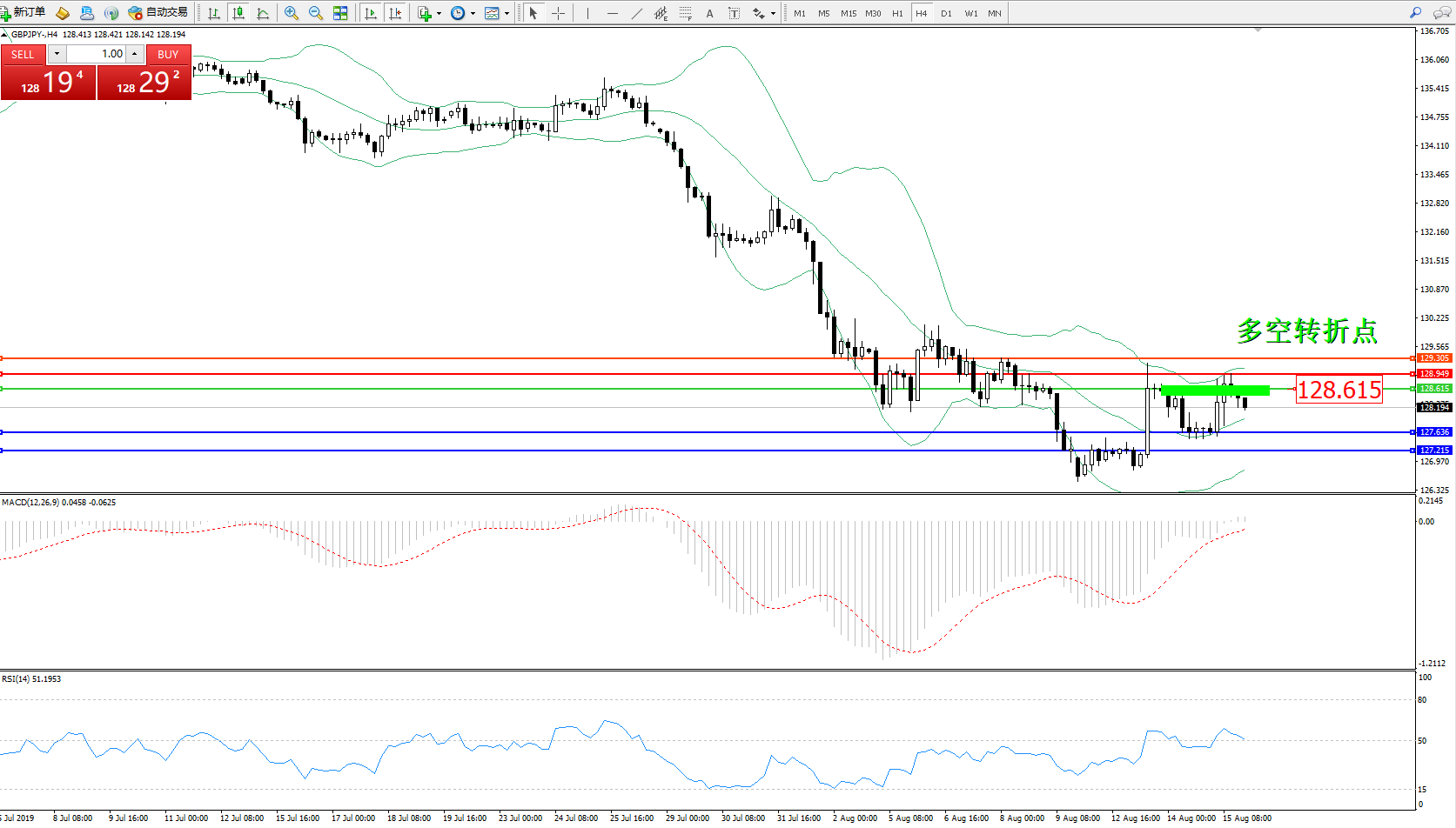 交易策略:128.615下方看跌,目标127.636127.215