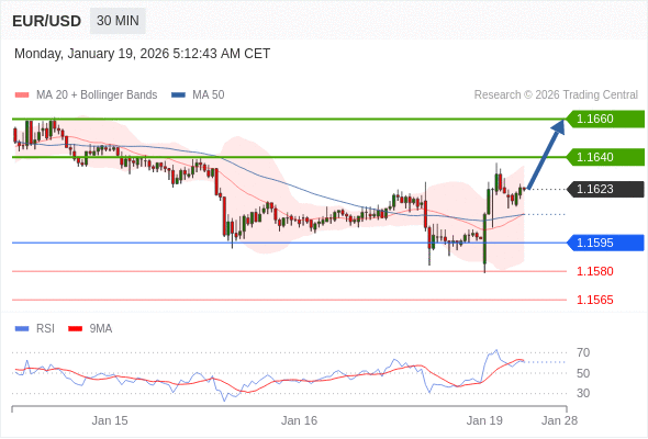在 1.1595 之上,看涨,目标价位为 1.1640 ,然后为 1.1660 。