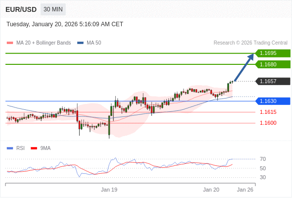 在 1.1630 之上,看涨,目标价位为 1.1680 ,然后为 1.1695 。