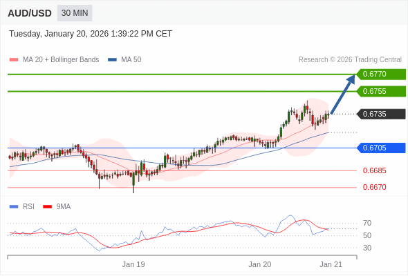在 0.6705 之上,看涨,目标价位为 0.6755 ,然后为 0.6770 。