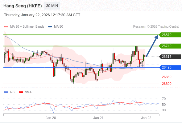 在 26490 之上,看涨,目标价位为 26740 ,然后为 26870 。