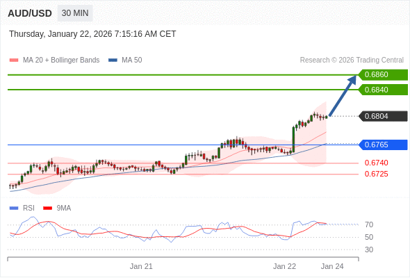 在 0.6765 之上,看涨,目标价位为 0.6840 ,然后为 0.6860 。