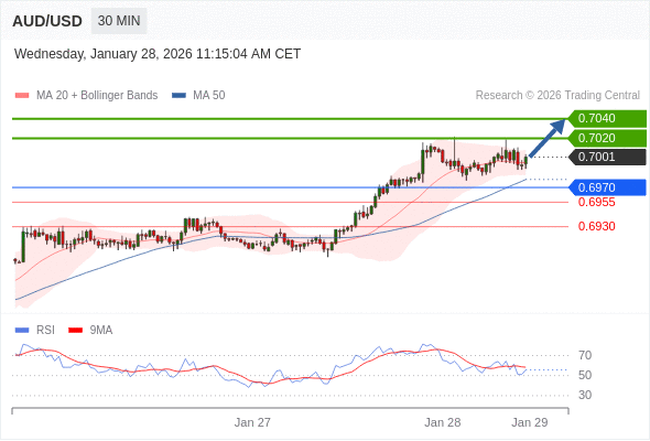 在 0.6970 之上,看涨,目标价位为 0.7020 ,然后为 0.7040 。