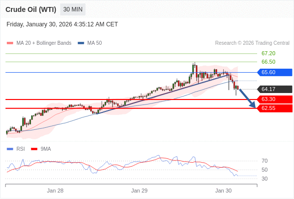 在 65.60 之下,看跌,目标价位为 63.30 ,然后为 62.55 。