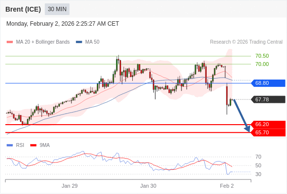 交易策略: 在 68.80 之下,看跌,目标价位为 66.20 ,然后为 65.70 。