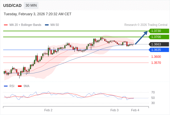 在 1.3635 之上,看涨,目标价位为 1.3700 ,然后为 1.3730 。