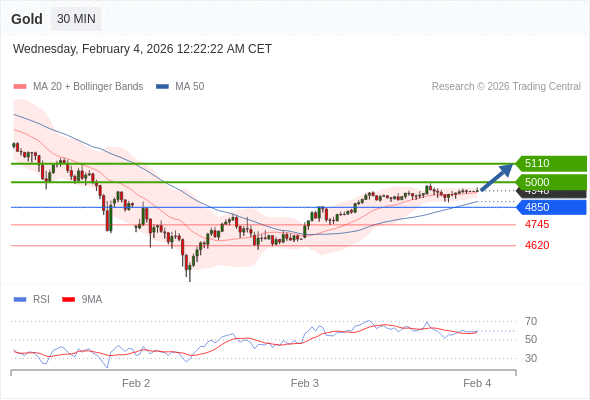 在 4850 之上,看涨,目标价位为 5000 ,然后为 5110 。