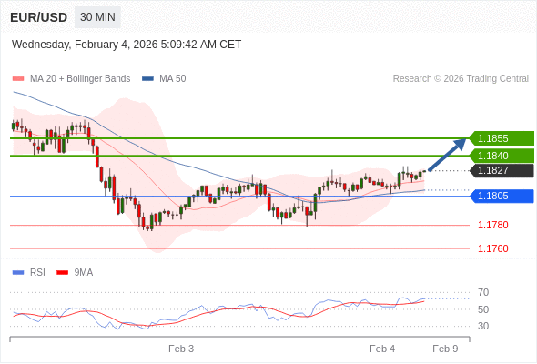 在 1.1805 之上,看涨,目标价位为 1.1840 ,然后为 1.1855 。