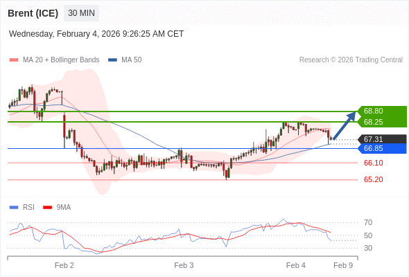 在 66.85 之上,看涨,目标价位为 68.25 ,然后为 68.80 。