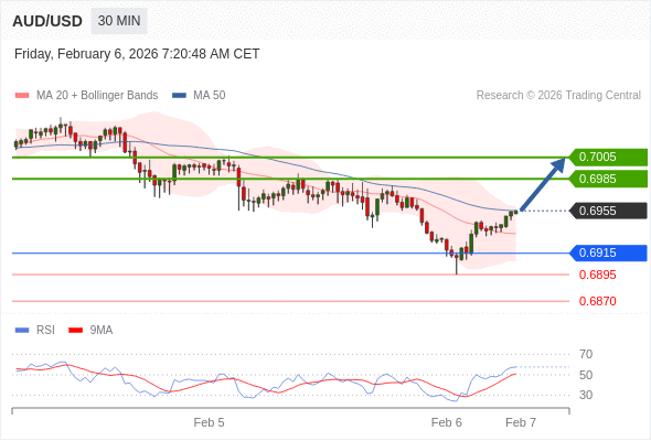 在 0.6915 之上,看涨,目标价位为 0.6985 ,然后为 0.7005 。