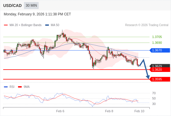 在 1.3670 之下,看跌,目标价位为 1.3620 ,然后为 1.3595 。