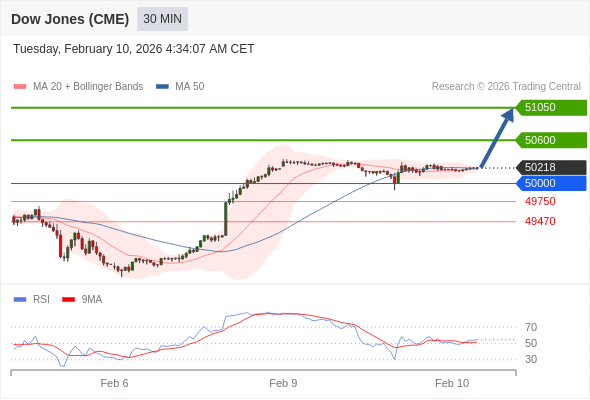 美国道琼斯指数期货 (H6) 当日内: 在50000之上,看涨。