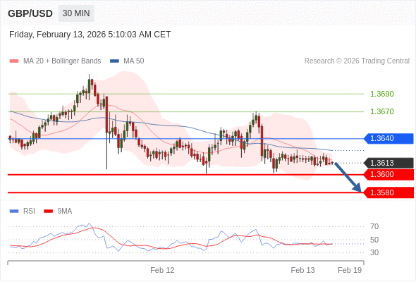 交易策略: 在 1.3640 之下,看跌,目标价位为 1.3600 ,然后为 1.3580 。