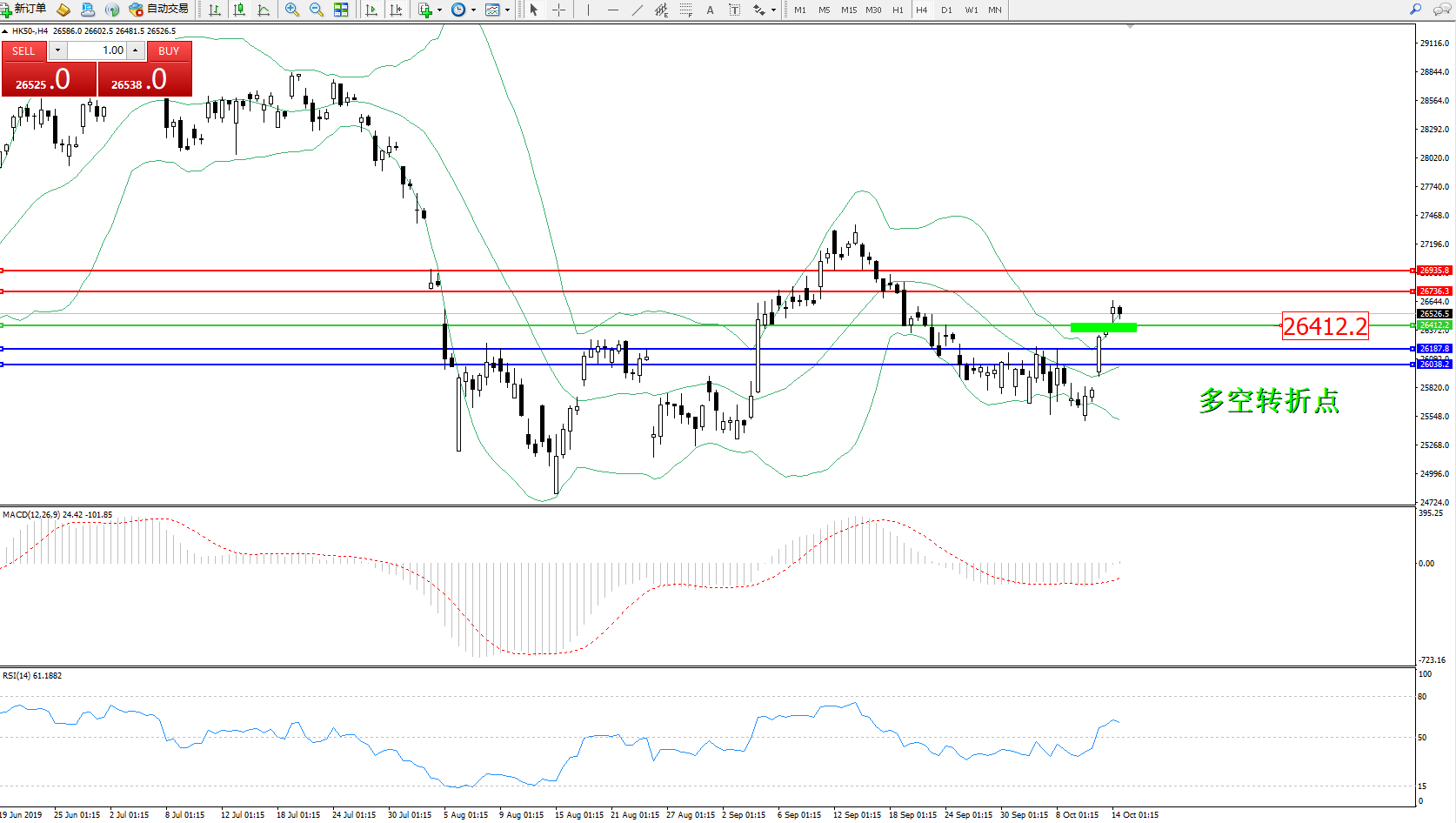 香港恒生指数10月14日(周一)收盘上涨213.41点,涨幅0.81%,报26521.85点;港股早上跟随外围造好而高开212点,随后再向上寻顶,恒指高见26636。续在高位上横行。国际贸易关系进展的相关消息提振股市上扬。市场对英国达成脱欧协议的乐观预期升温。美国经济数据支持美联储降息预期,且贸易关系磋商步入良性阶段也给市场带来稳定因素。