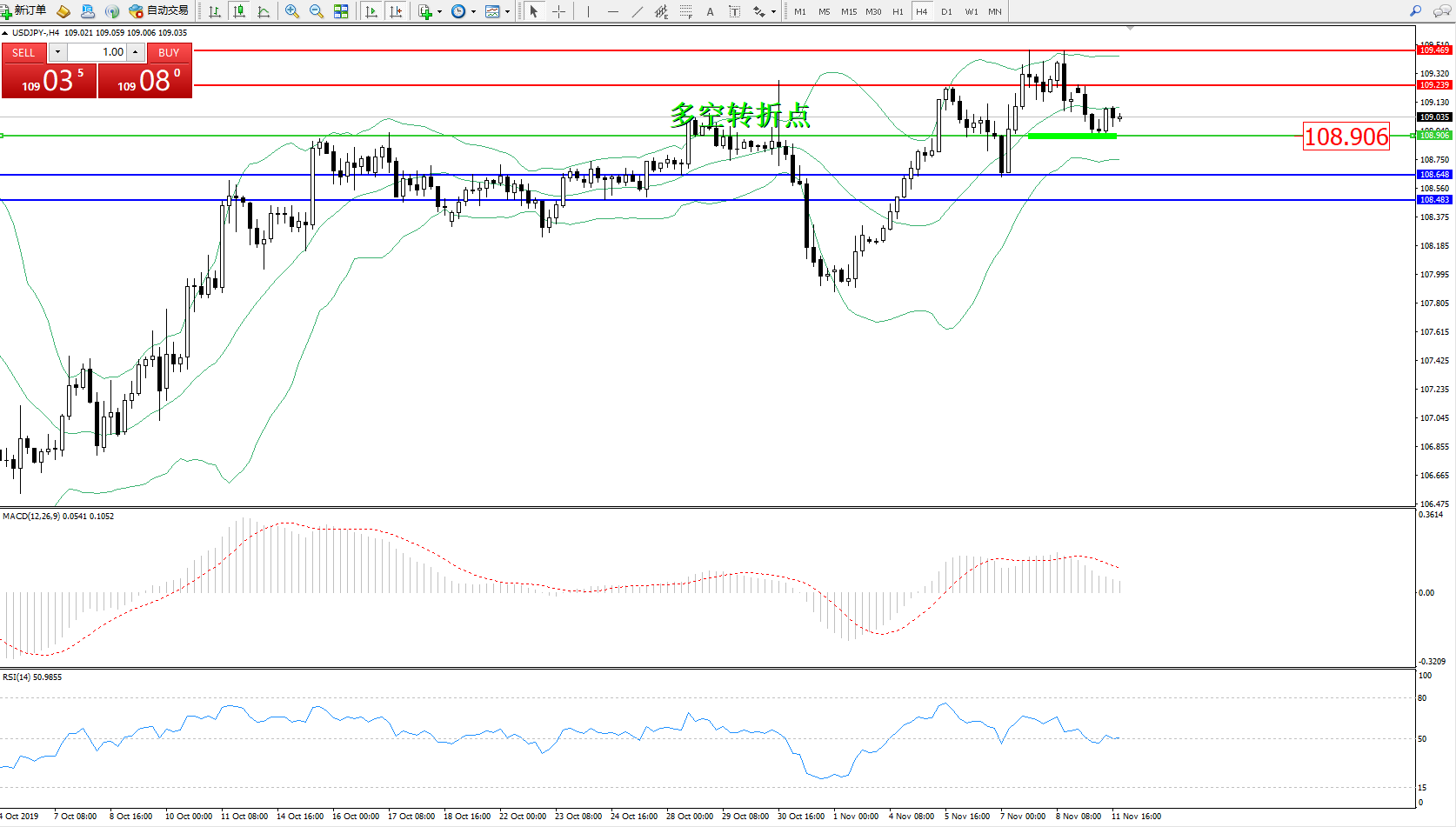 交易策略:108.906上方看涨,目标109.239109.469