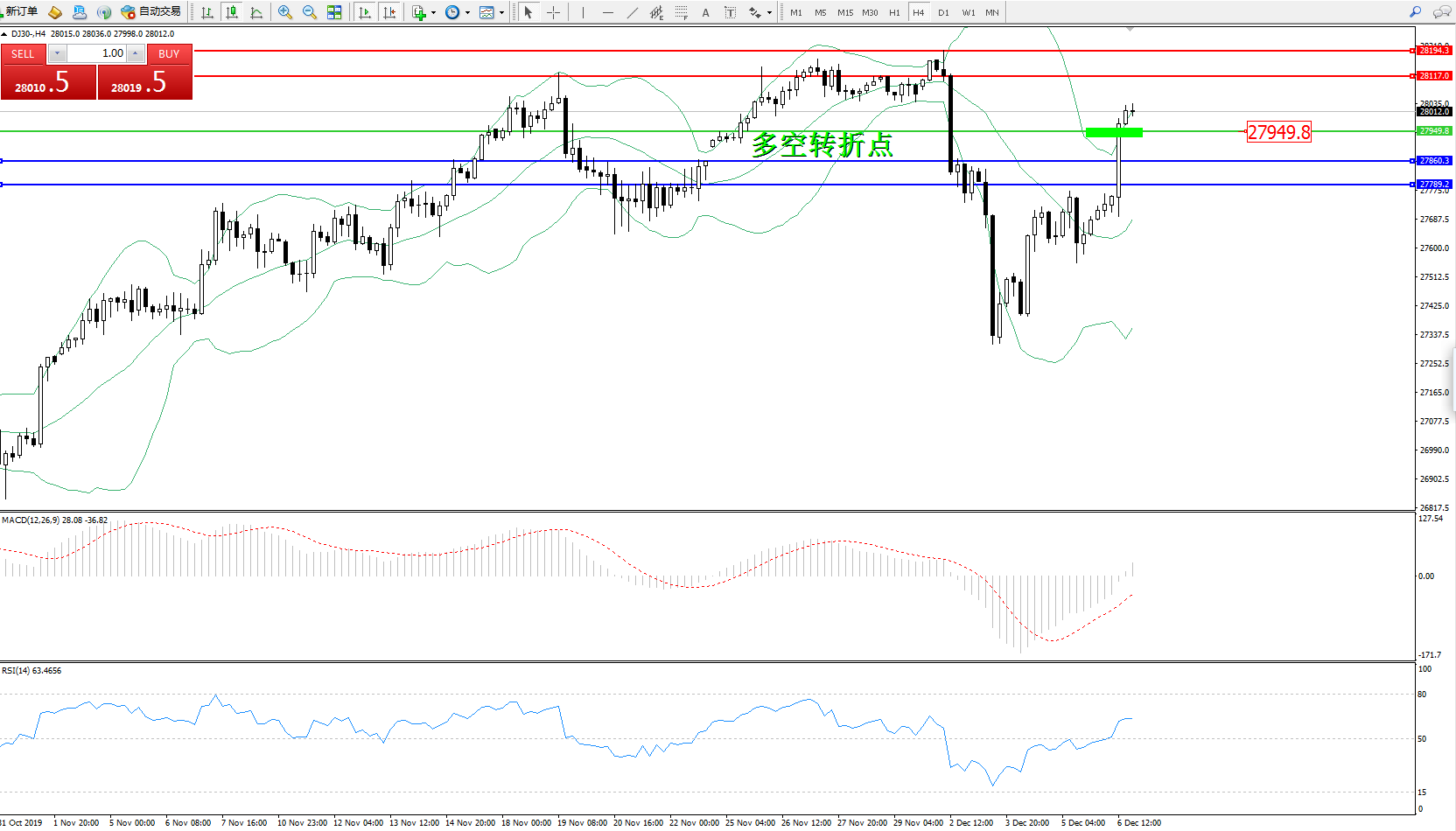 道琼斯指数DJ30—— 4小时K线图显示: