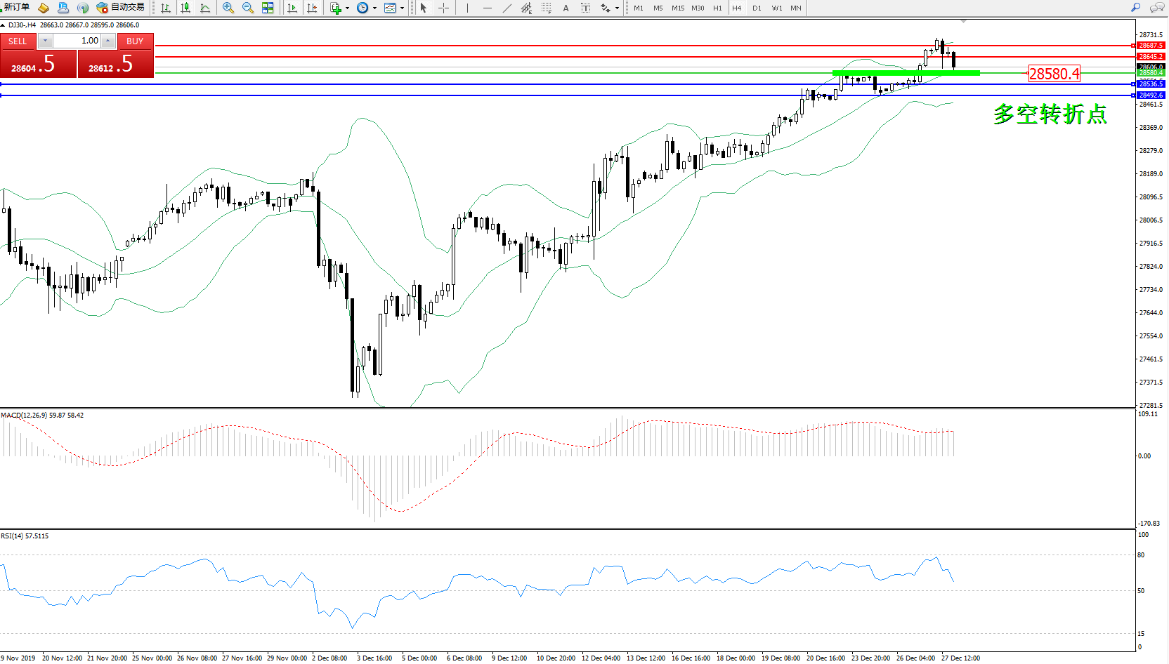 道琼斯指数DJ30—— 4小时K线图显示: