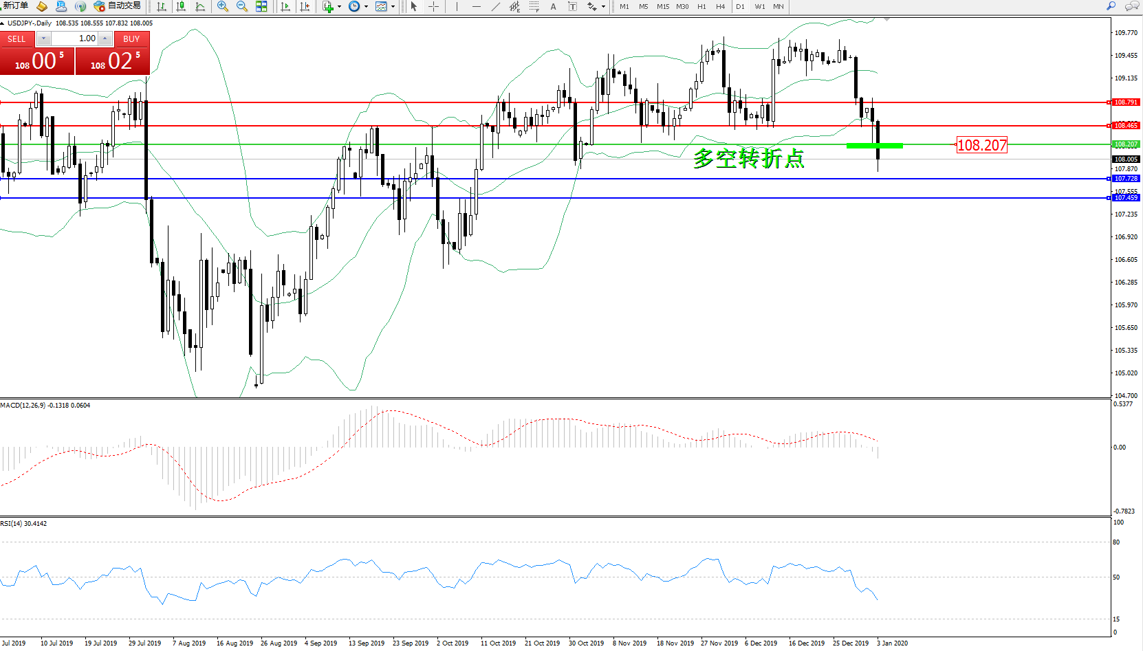 交易策略:108.207下方看跌,目标107.728107.459