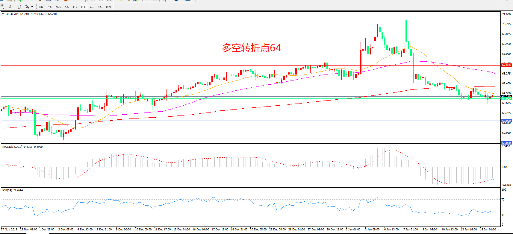 交易策略:在64.00之下看跌,目标62.00    60.00
