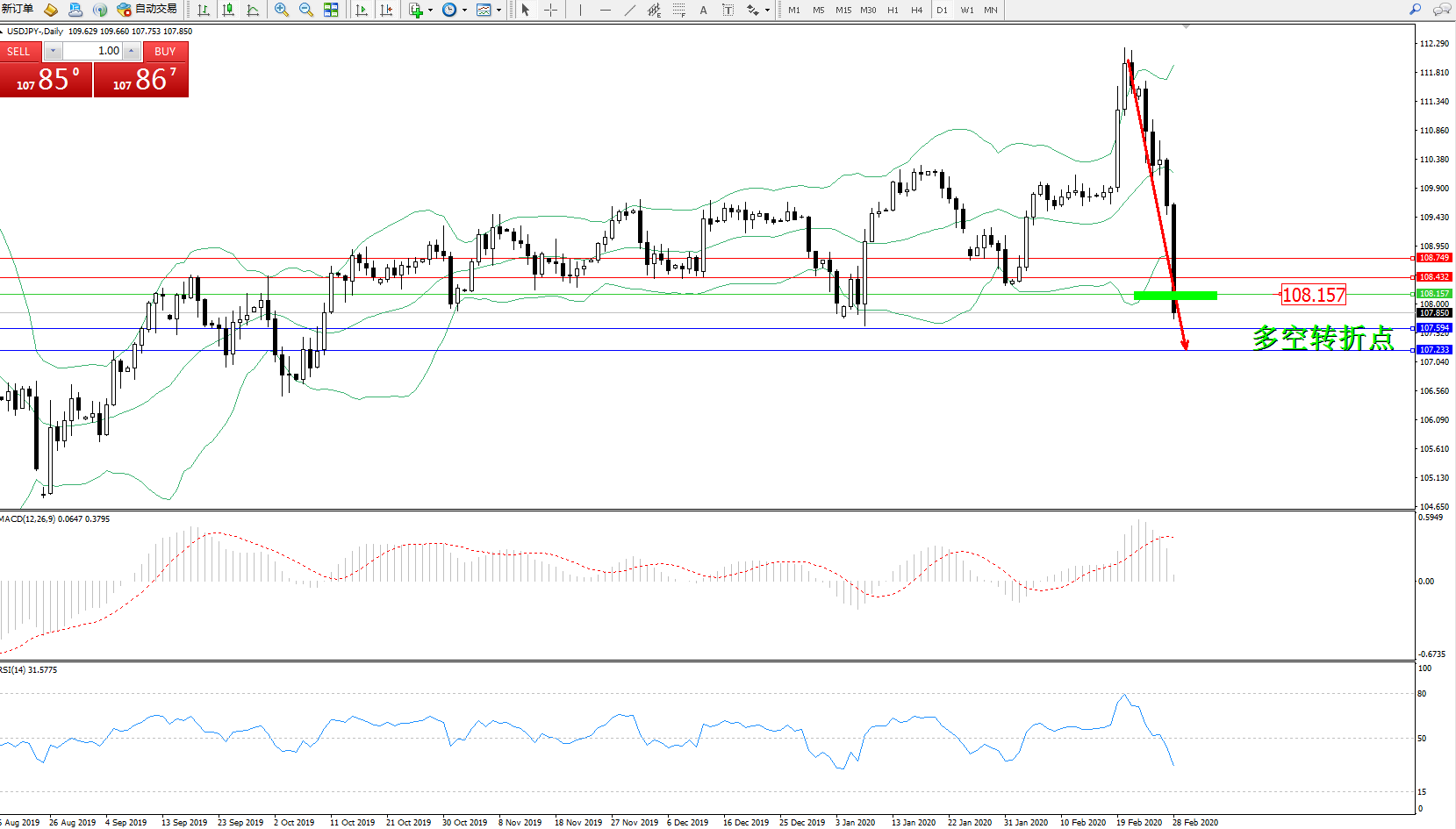 交易策略:108.157下方看跌,目标107.594107.233