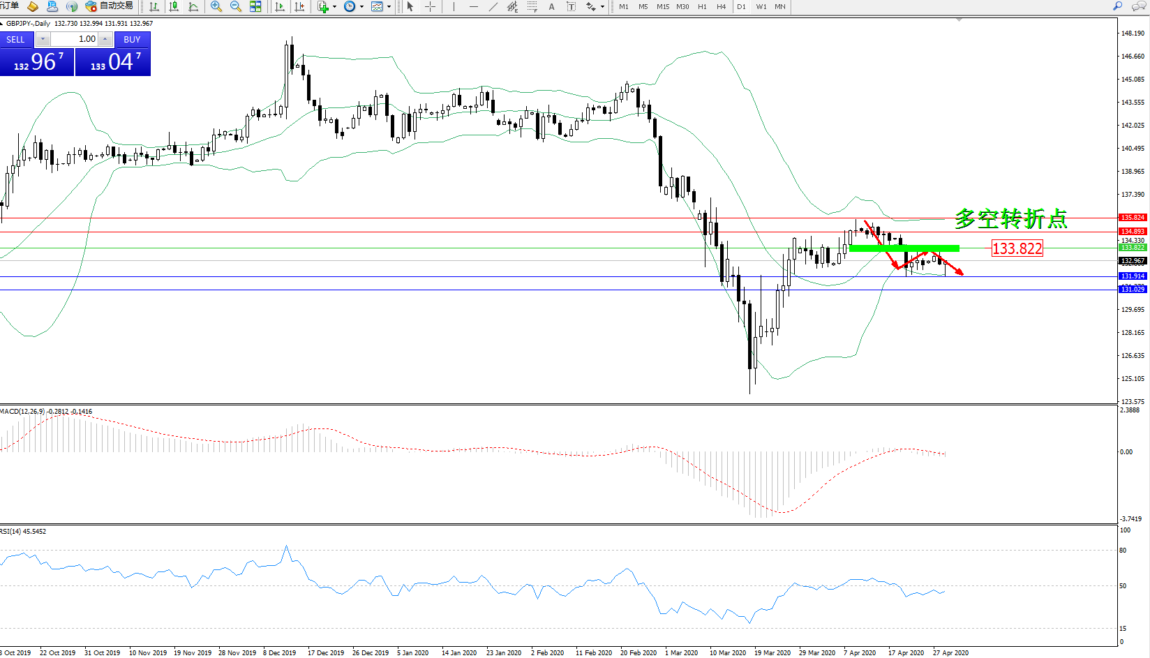 交易策略:133.822下方看跌,目标131.914、131.029