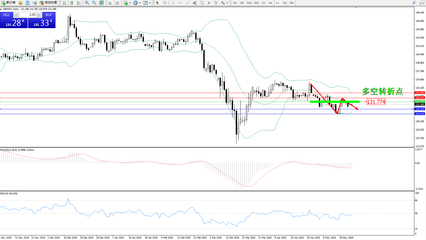 交易策略:131.774下方看跌,目标130.424129.539