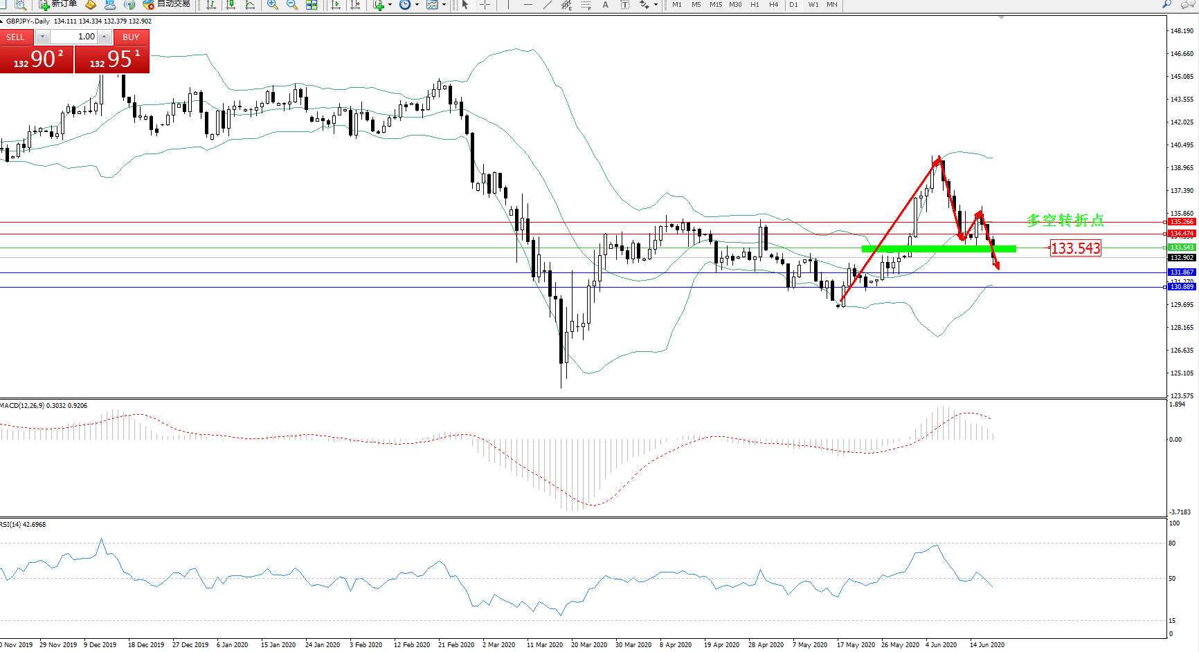 交易策略:133.543下方看跌,目标131.867、130.889
