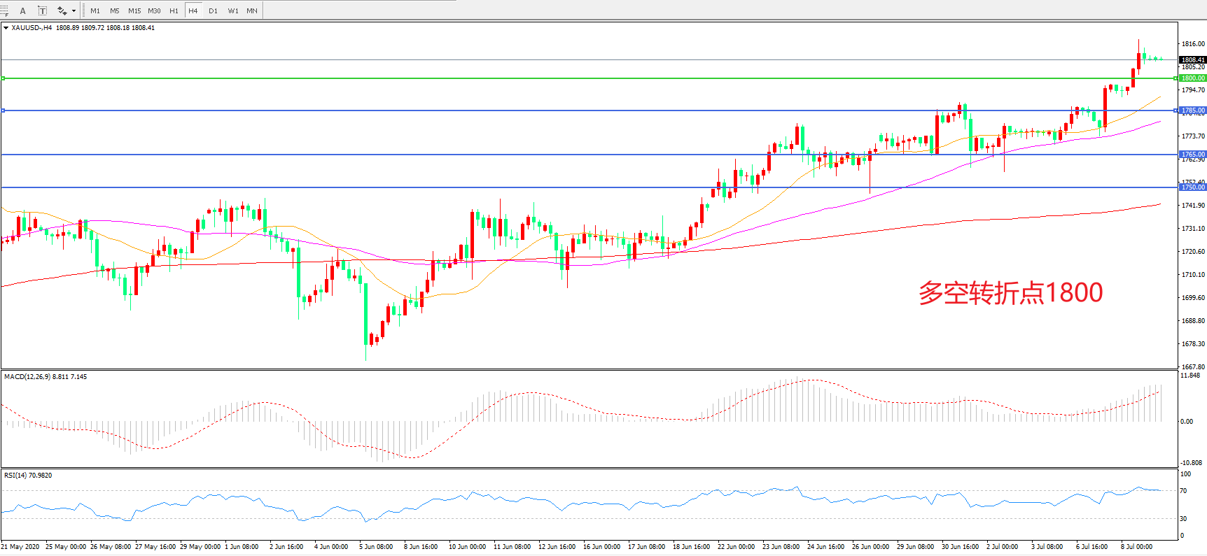 交易策略:在1800.00之上看涨,目标1820.00   1845.00