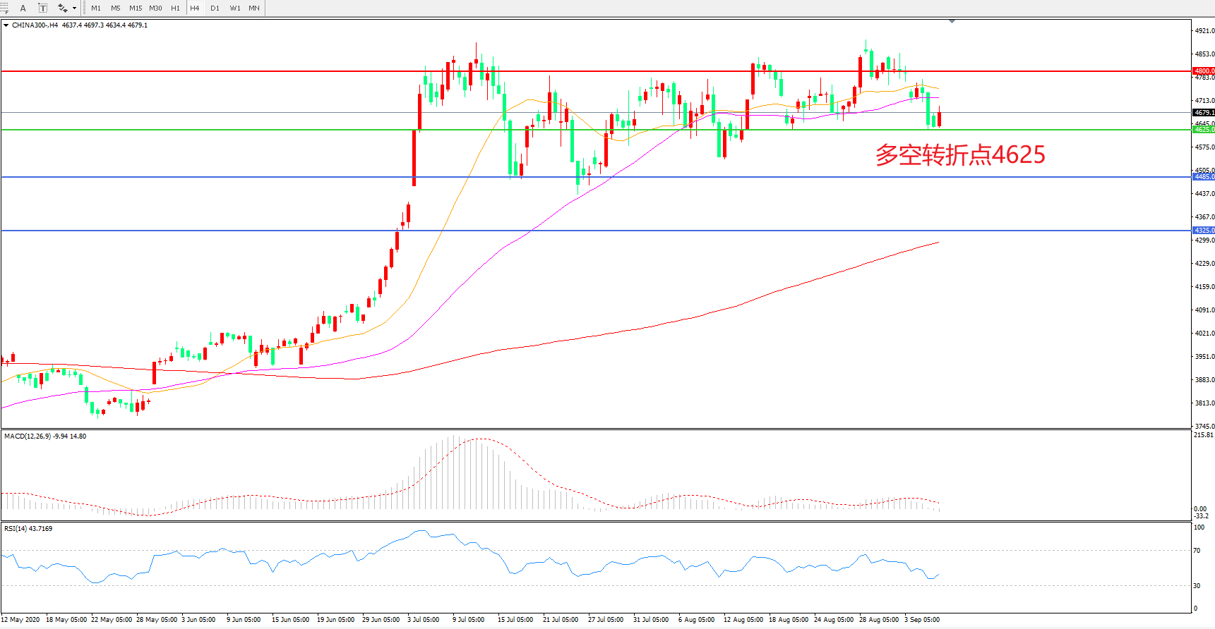 4小时图看,沪深300延续高位震荡,横盘迹象较为明显,均线系统走平, MACD绿柱增加,RSI指标向上,日内延续震荡概率较大。