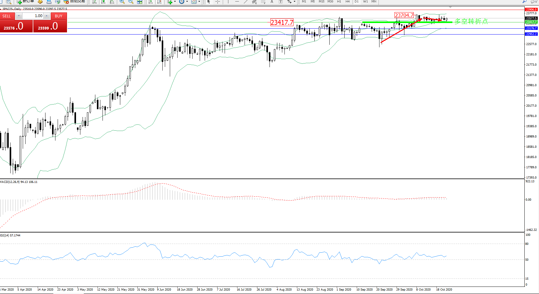 日经225指数10月22日(周四)收盘下跌157.96点,跌幅0.67%,报23481.50点。日本政府相关人士22日透露,政府开始协调有条件允许72小时以内“超短期”商务目的的入境。此举旨在新型冠状病毒疫情下推进与海外的商务。最快将于11月启动该做法.日本央行:日本金融体系总体保持稳定。新冠疫情对金融活动有重大影响。金融市场对不确定性仍然敏感。金融市场已经开始逐渐恢复稳定。疫情前景的不确定性对经济的影响非常大。如果经济持续低迷,金融机构的健康可能会受到伤害。日本可能可以暂时避免企业违约上升,但如果经济持续低迷,企业偿还债务的能力将减弱。日本商业银行在低盈利能力的情况下增加了海外贷款,因此必须密切关注事态发展。