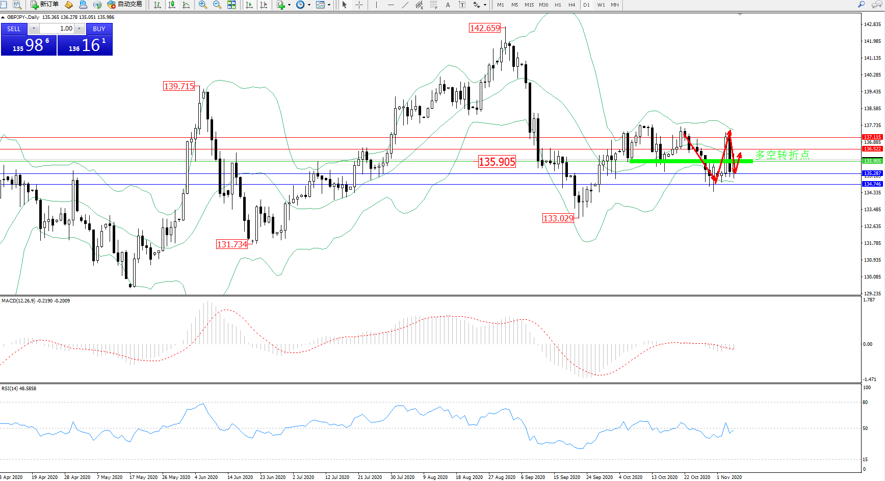 备选策略:135.905上方看涨,目标136.522、137.115