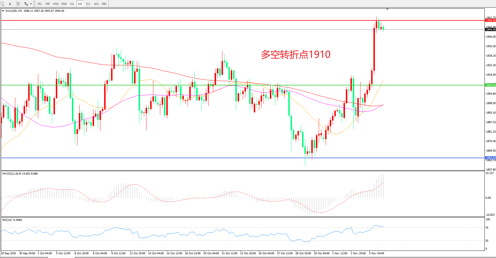 4小时图看,金价自低位长阳连续拉升,整体表现偏强,1910成为多空分水岭,1950成为短期阻力, MACD红柱增加,RSI指标走平,日内延续上行概率较大。