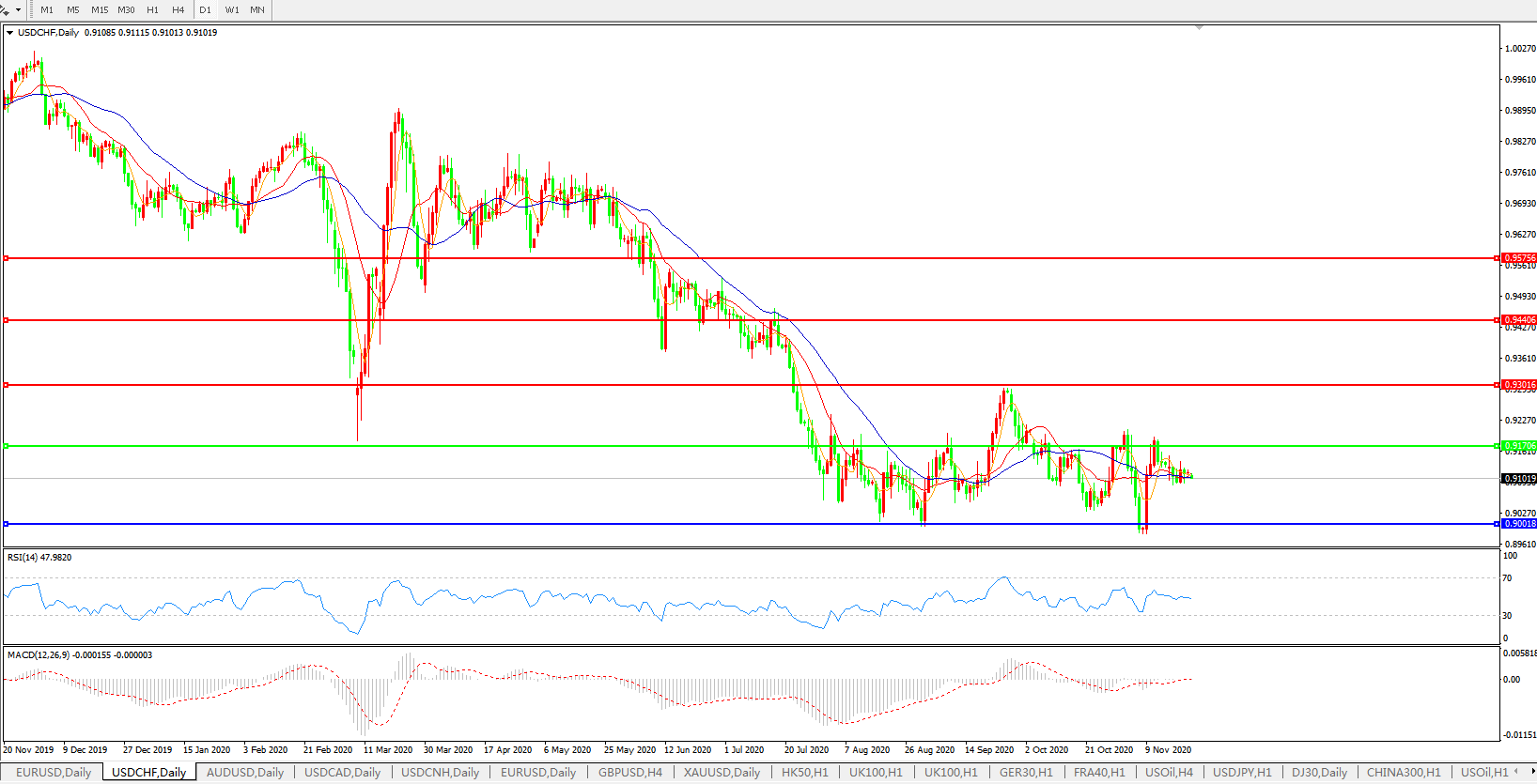 目前美元兑瑞郎USD/CHF测试并维持在关键支撑0.90水平之上。我行认为,拜登胜选支持美元走弱的预期,此外,美联储料将加强宽松货币政策以支持经济复苏,尤其是在国会可能维持分裂的情况下; 瑞郎和金价一样,一直是美元贬值交易的主要受益者,欧洲央行或将于12月宣布进一步扩大量宽计划规模也会加大瑞郎兑欧元的吸引力。受前所未有的新冠疫情冲击,全球货币政策不太可能出现紧缩,瑞郎还将持续走强