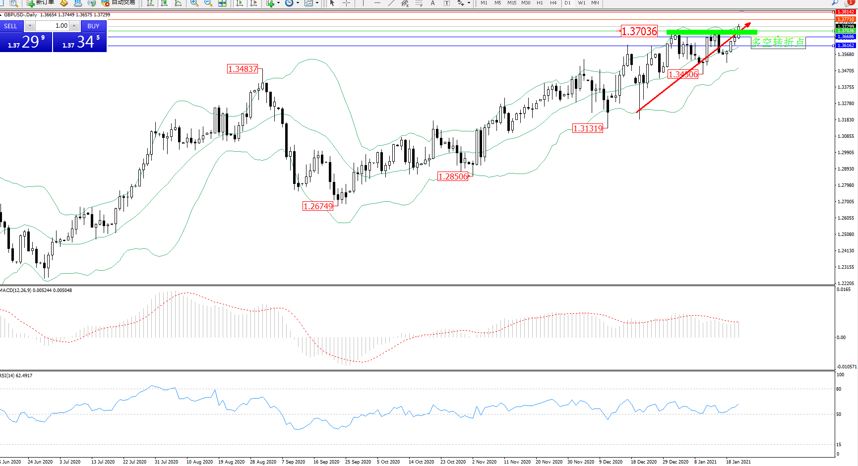 交易策略:1.37036上方看涨,目标1.37710、1.38142