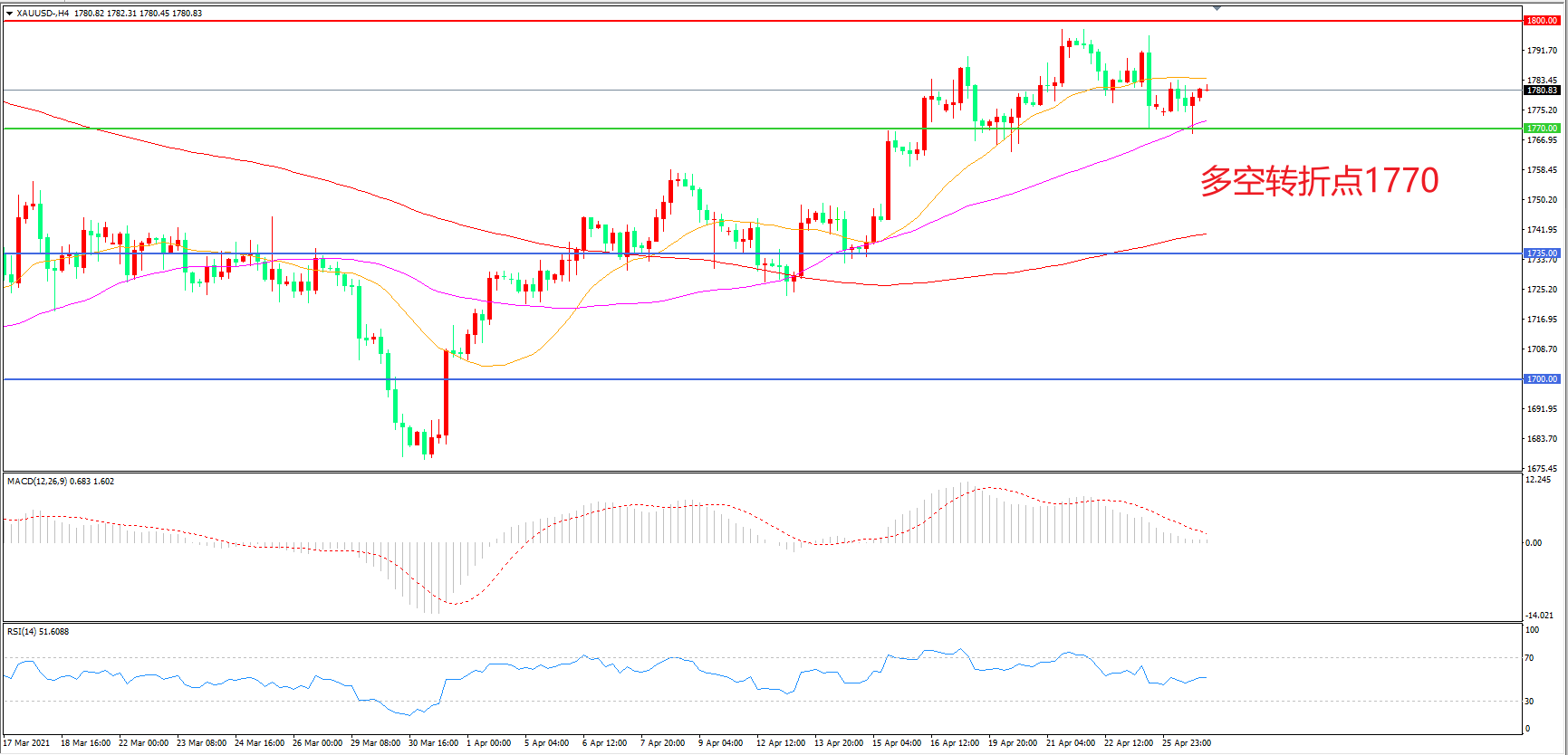 周一(4月26日),美元指数和美国国债收益率回落提振了金价近期的表现,但美国经济数据强劲带来风险,加上美联储会议招考在即,部分投资者选择平仓结利,现货黄金大幅回撤后震荡回升,收报1781.24美元/盎司。目前市场认为随着全球经济动能增强,美元可能继续走低,美国经济距离‘取得明显进展’这一美联储缩减资产购买的门槛还很远。