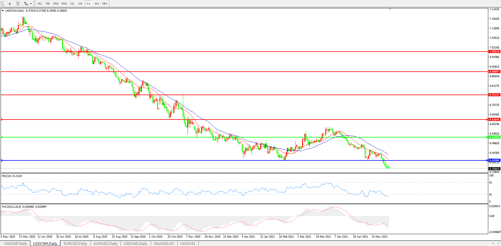 美元兑人民币USDCNH 日线图: