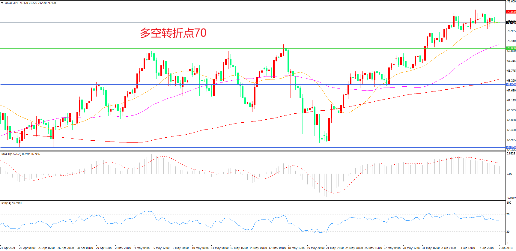 周一 (6月7日),国际原子能机构称,美伊谈判已进入决定性阶段,市场等待6月10日本周四的第五轮伊朗核谈判结果,布伦特原油高位窄幅震荡,收报71.42美元/桶,如果本轮不能达成协议,油价有望再度冲高,如果美伊达成协议,将明显增加原油供应,引发投资者获利了结。