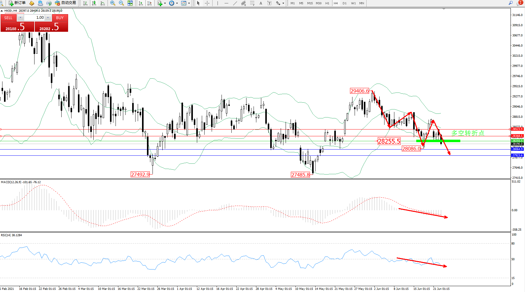 交易策略:28255下方看跌,目标28064、27923