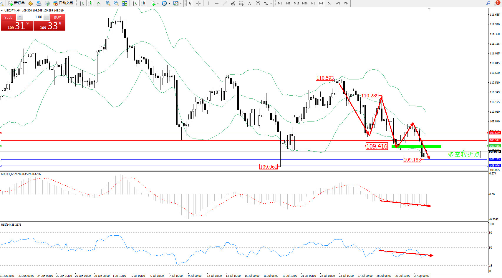 交易策略:109.416下方看跌,目标109.183、109.076