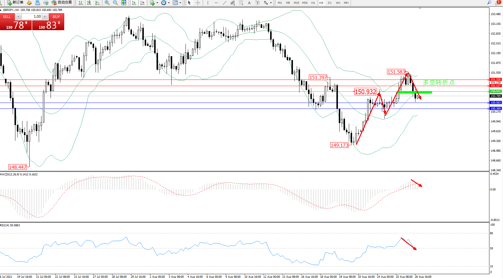 交易策略:150.932下方看跌,目标150.563、150.369