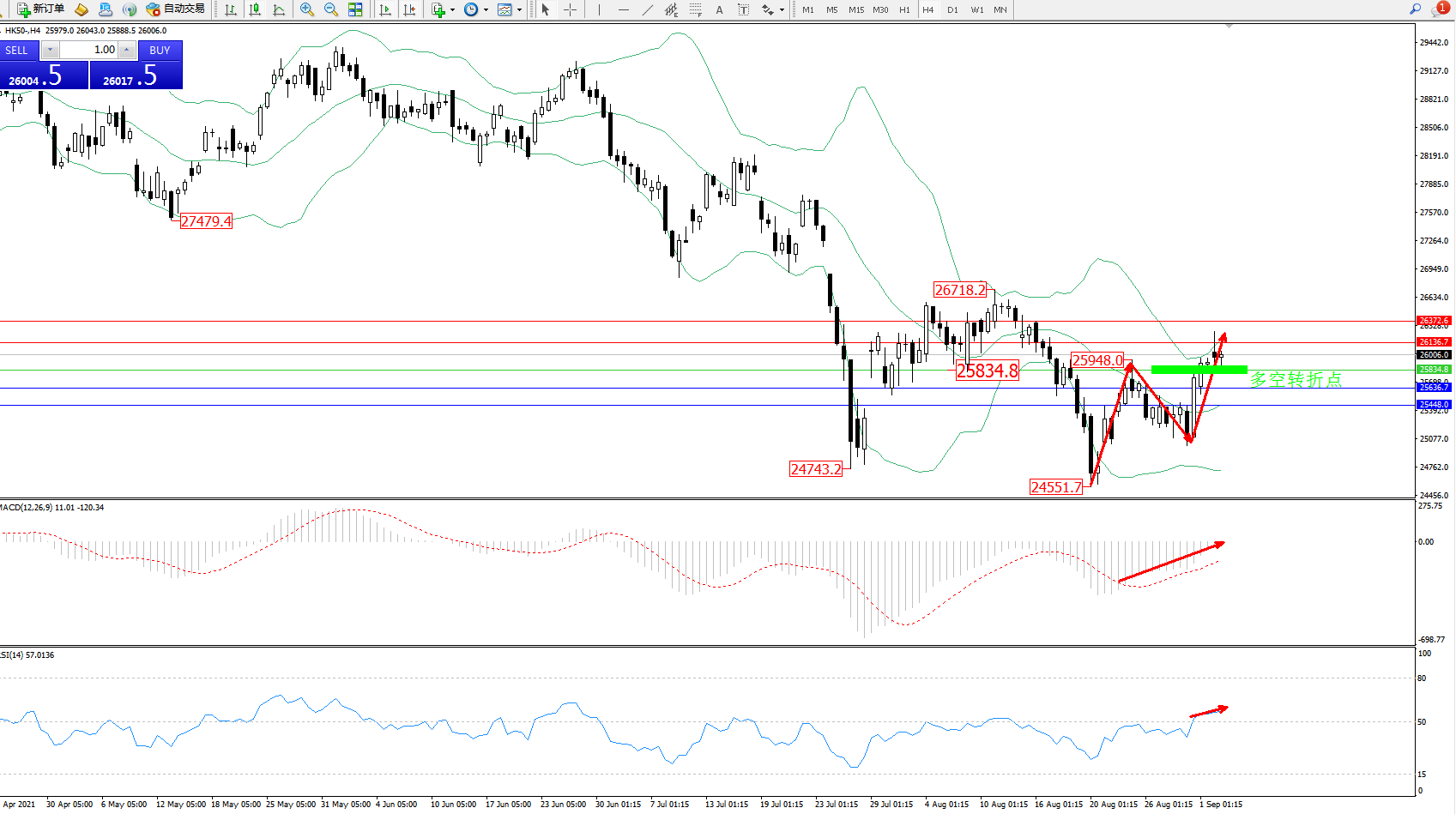 交易策略:25834上方看涨,目标26136、26372