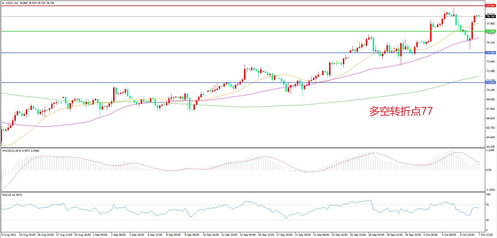 4小时图看,油价触碰80美元附近后小幅回落,但上行趋势依然完好,均线系统呈多头排列,MACD红柱增加,RSI指标走平,日内震荡上行概率较大。