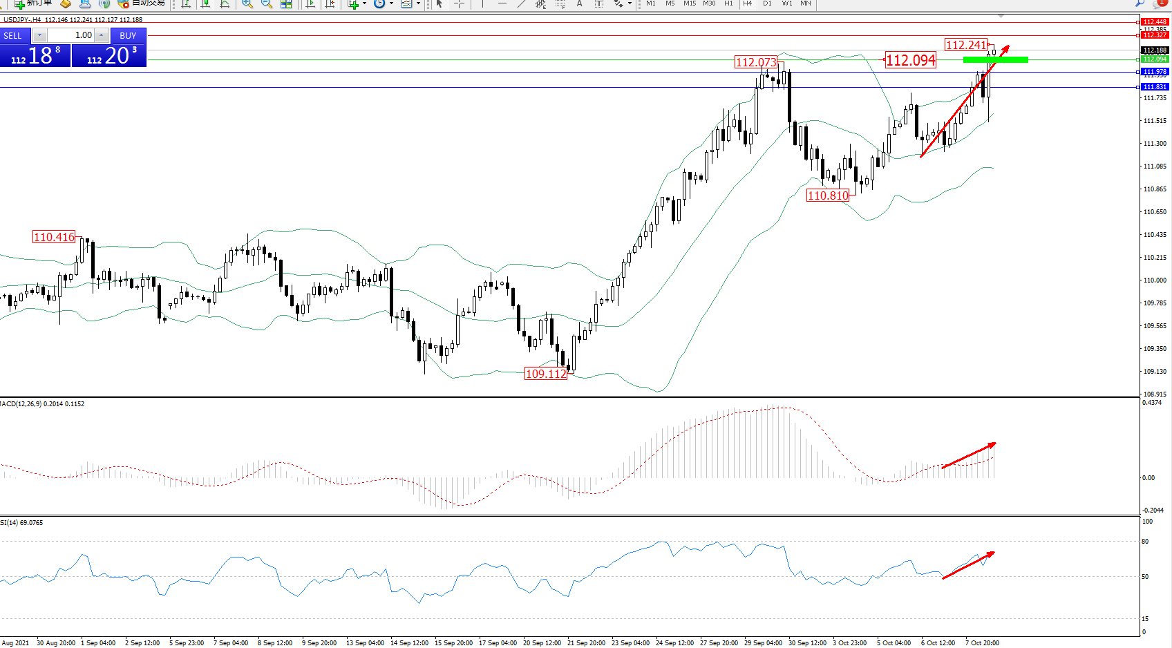 技术点评:多头动力延续布林带指标上轨附近持续震荡上扬,高位抵达112.241位置后开始震荡,多头动力有进一步向上移动态势,布林带指标呈上行趋势后开始以后张口迹象,MACD指标处于多头区域维持震荡持续上扬,RSI指标处于多头区域维持整理向上移动中;