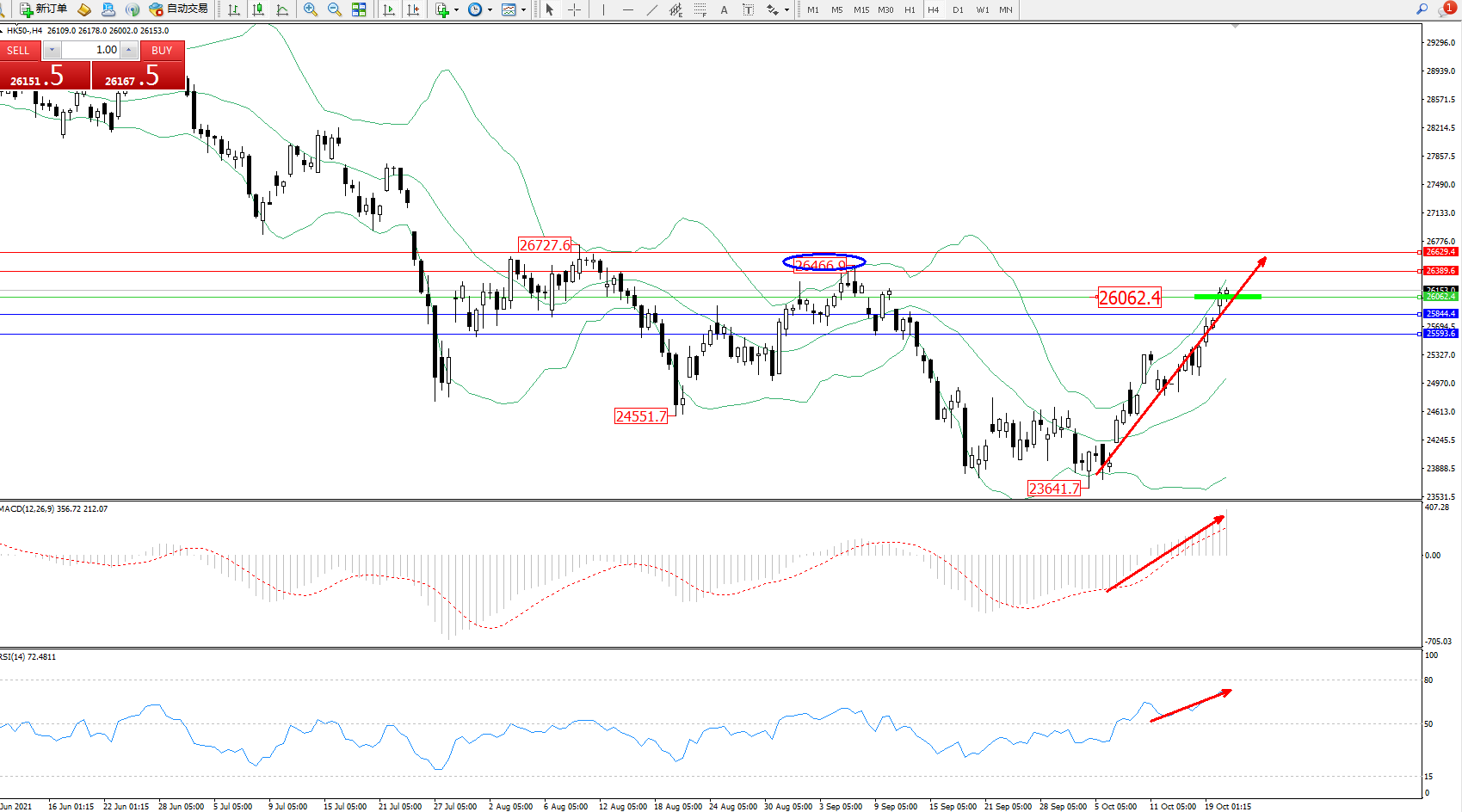 技术点评:多头动力延续布林带指标上轨附近持续拉升上扬,多头动力未见止步迹象,布林带指标呈张口走势态势良好,前期高位26466位置近在咫尺破位在即,MACD指标处于多头区域维持震荡拉升向上移动中,RSI指标处于多头区域维持震荡上扬中;