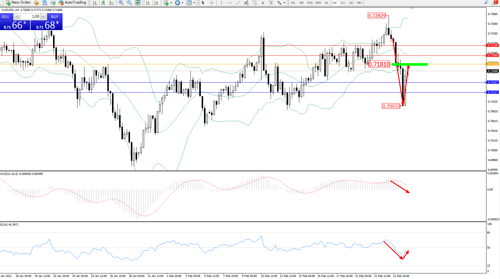 交易策略:0.71810下方看跌,目标0.71427、0.71217