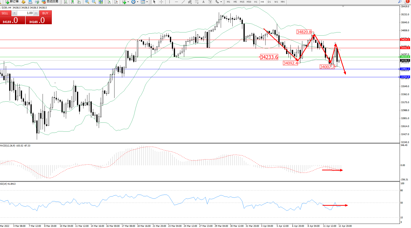 交易策略:34233下方看跌,目标33951、33764