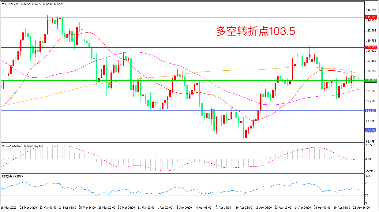 周四(4月21日),俄乌冲突交火不断,西方国家对俄罗斯石油实施禁运而引发的供应担忧进一步凸显,美国WTI原油延续窄幅震荡走势,收报103.50美元/桶。目前影响油价的因素仍然纷繁复杂,地缘风险仍然是最主要因素,短期看EIA数据的超预期利多限制了油价的调整幅度,短期油价延续窄幅震荡概率较大。